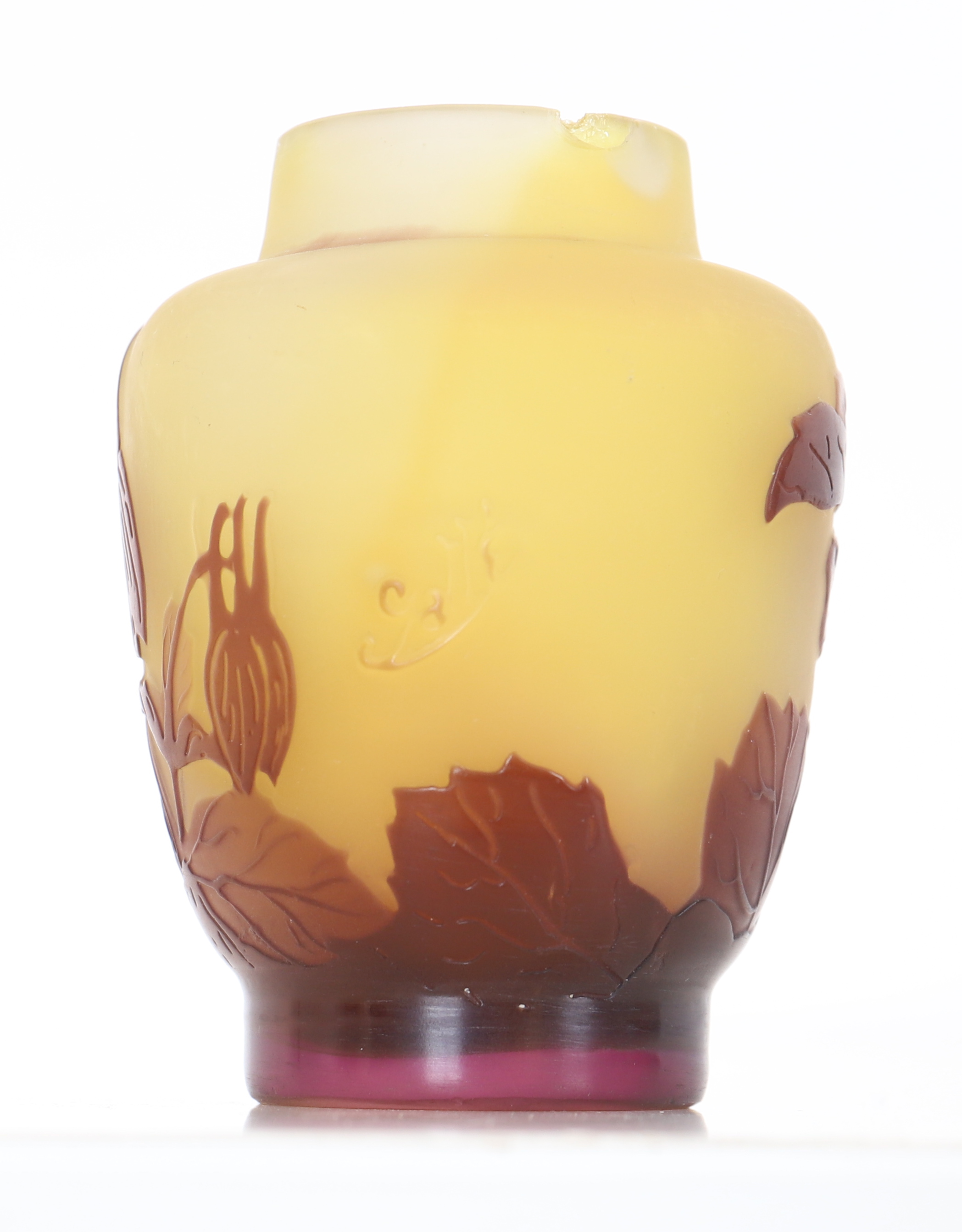 Lot 207 - Vase en verre multicouche gravé à l’acide à décor de fleurs d'iris. Eclat sur le col Epoque XXème siècle Dimensions: H: 7,5; L: 8; D: 5,5 cm