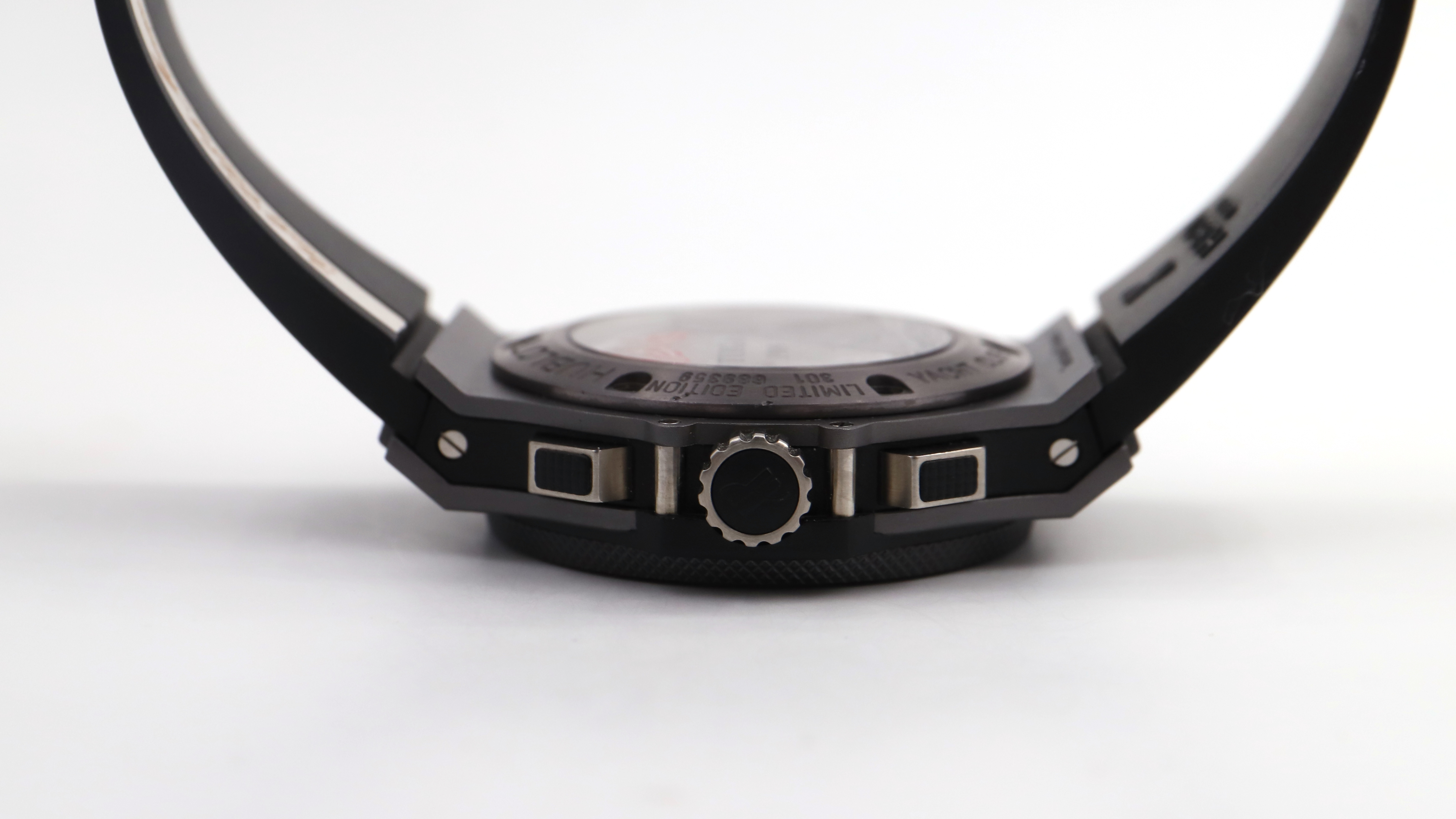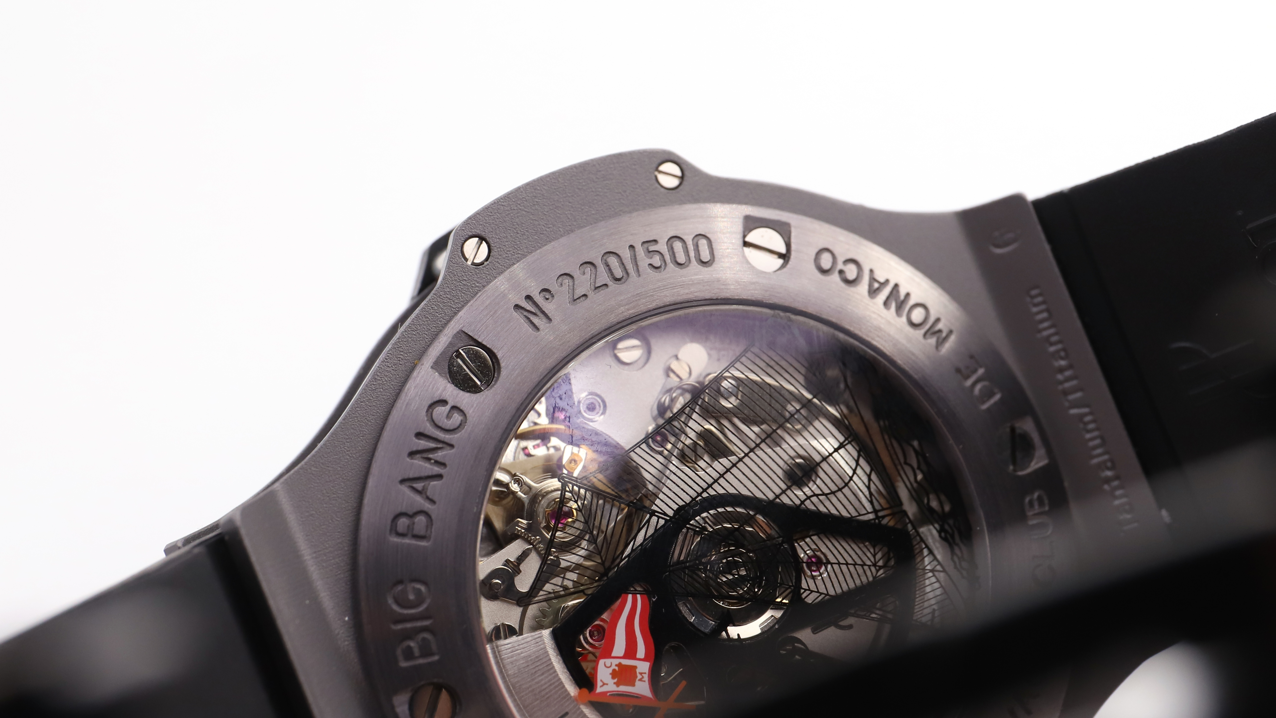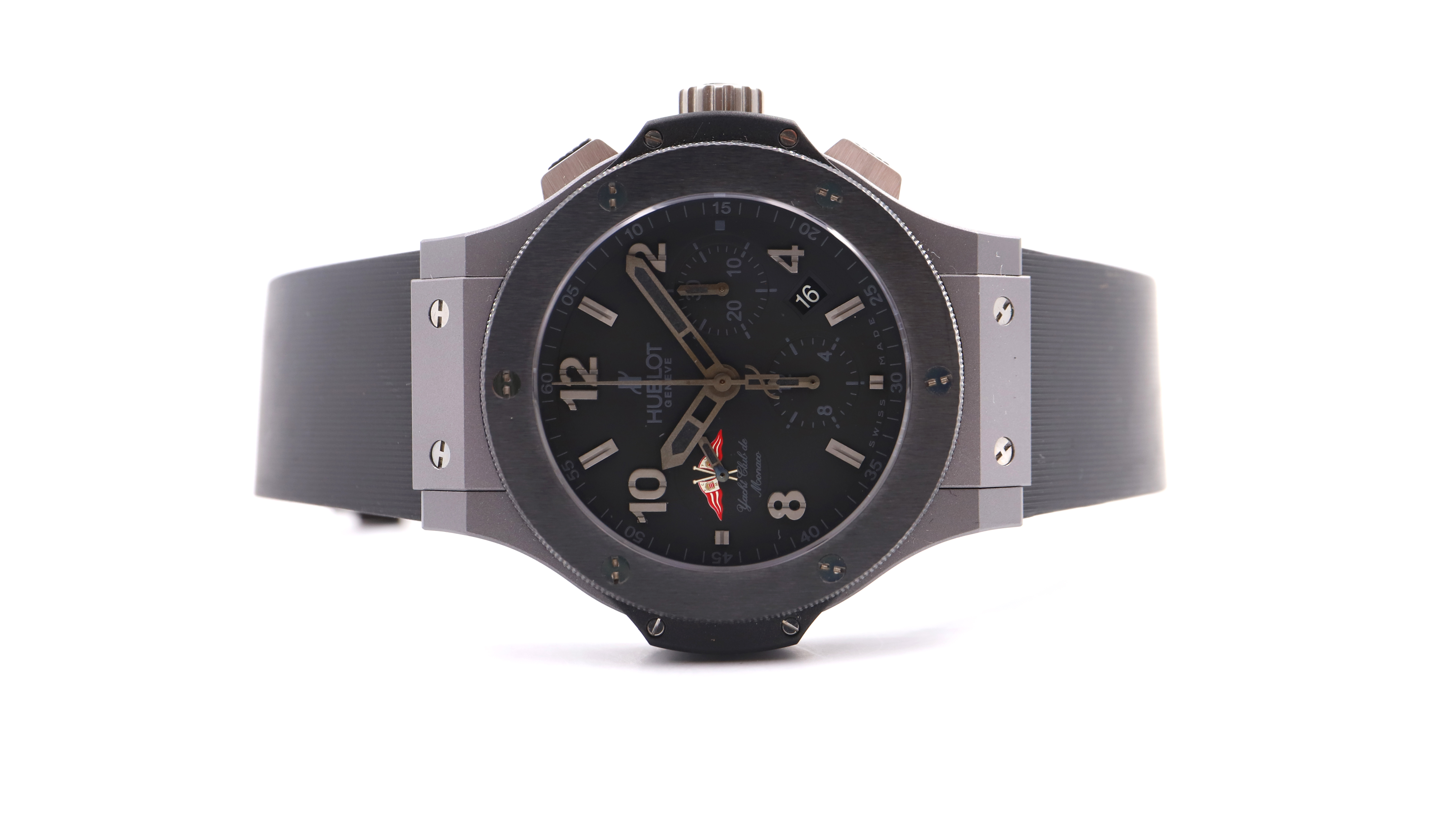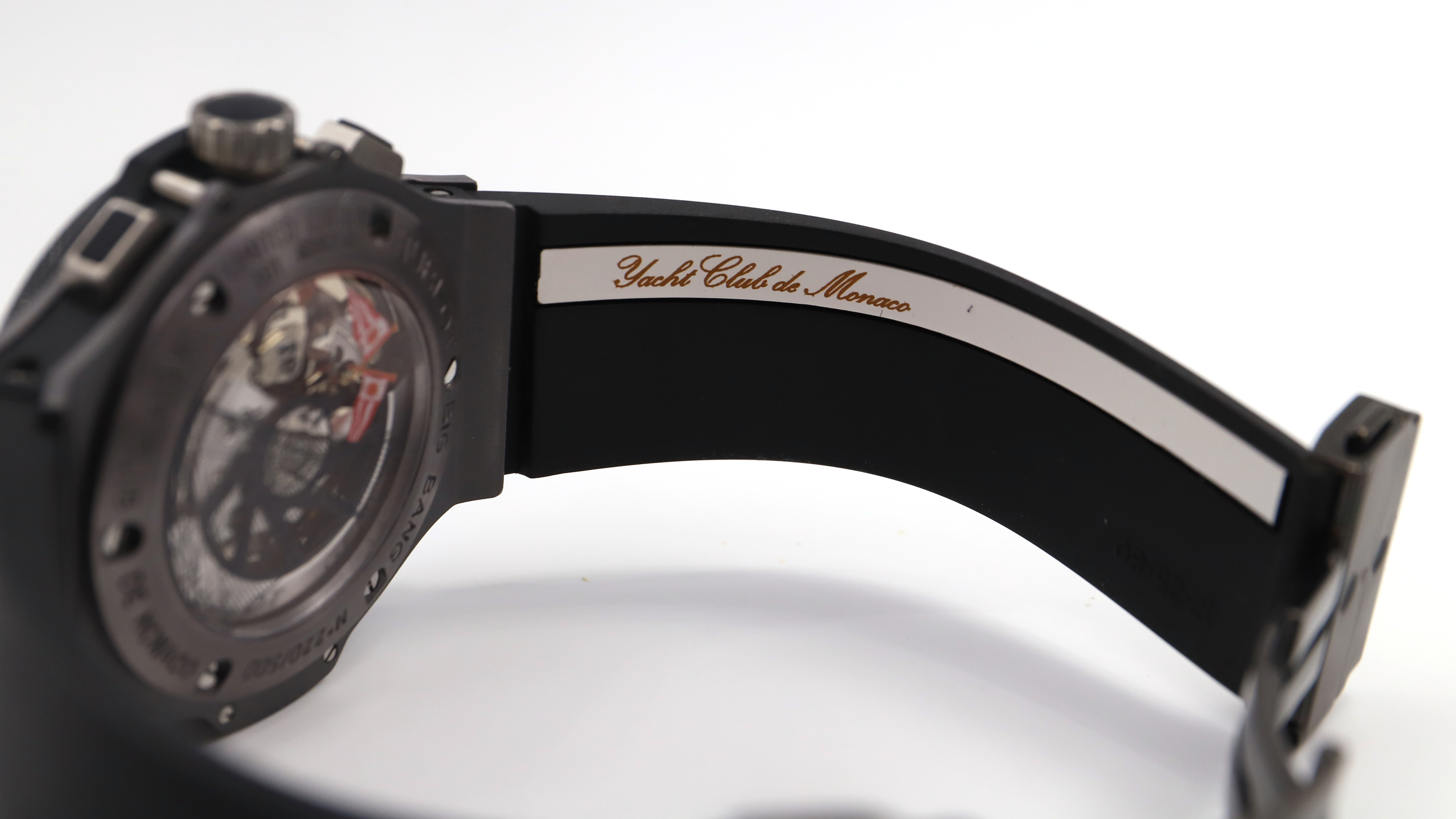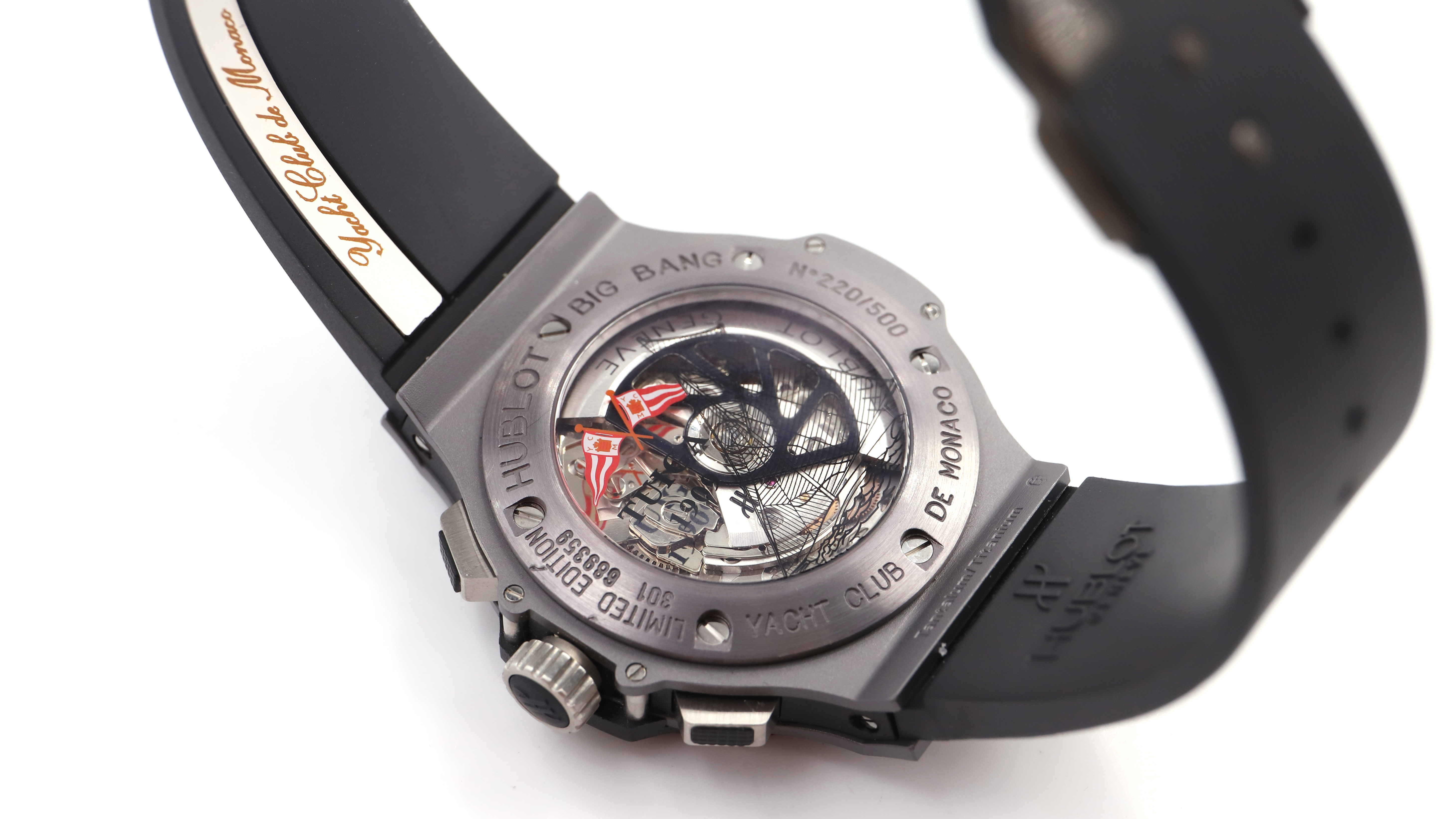 Hublot Big Bang - Yacht Club de Monaco Ref 301 No. 689359 Limited edition 220/500 Men's chronograph wristwatch in titanium and ceramic, black dial, applied baton hour markers and Arabic numerals, 30-minute and 12-hour totalizer counters, seconds hand at 9 o'clock, date window at 4 o'clock. Self-winding mechanical movement. Skeletonized case back. Rubber strap with signed titanium folding clasp. Signed case, dial, and movement. No box or papers. Diameter: 44mm. At the time of cataloging, the movement was functioning and in near-new condition.