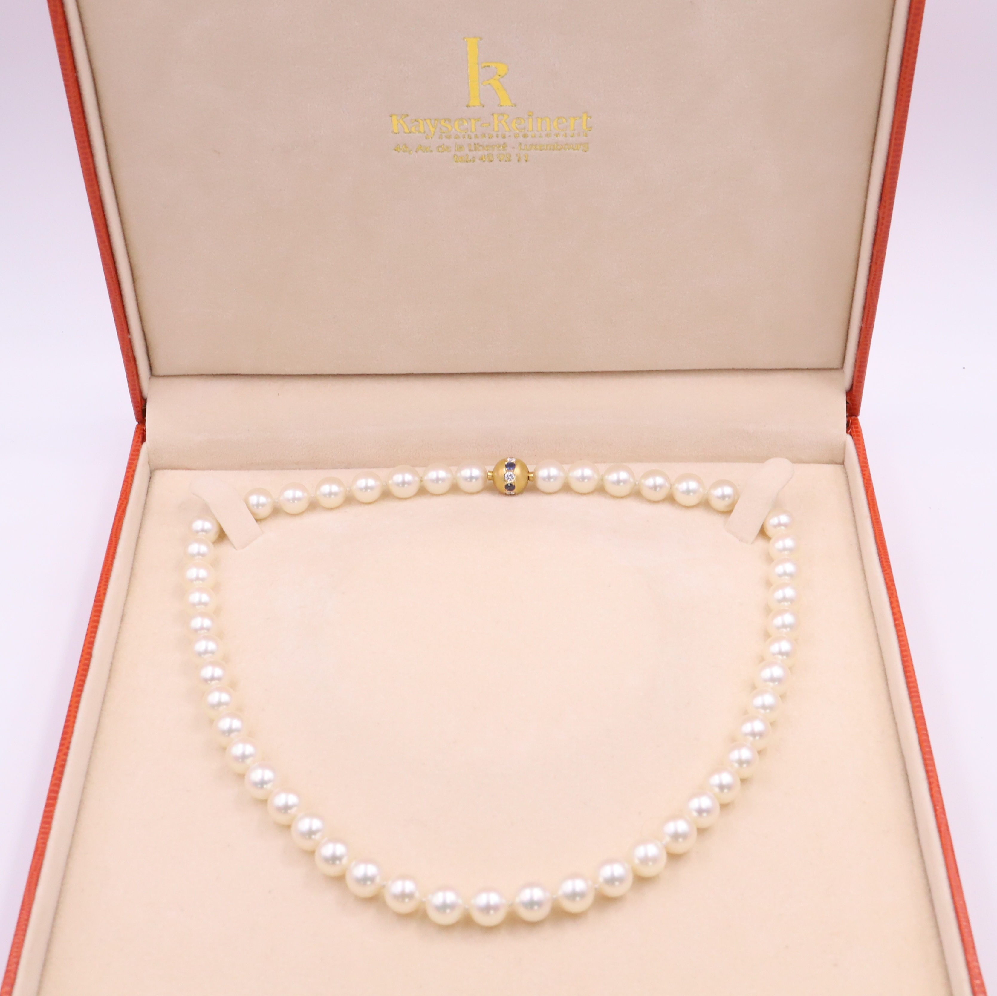 Collier de perles de culture, un noeud entre chaque perle, un fermoir ressort en or jaune 18k sertis de saphirs et brillants.