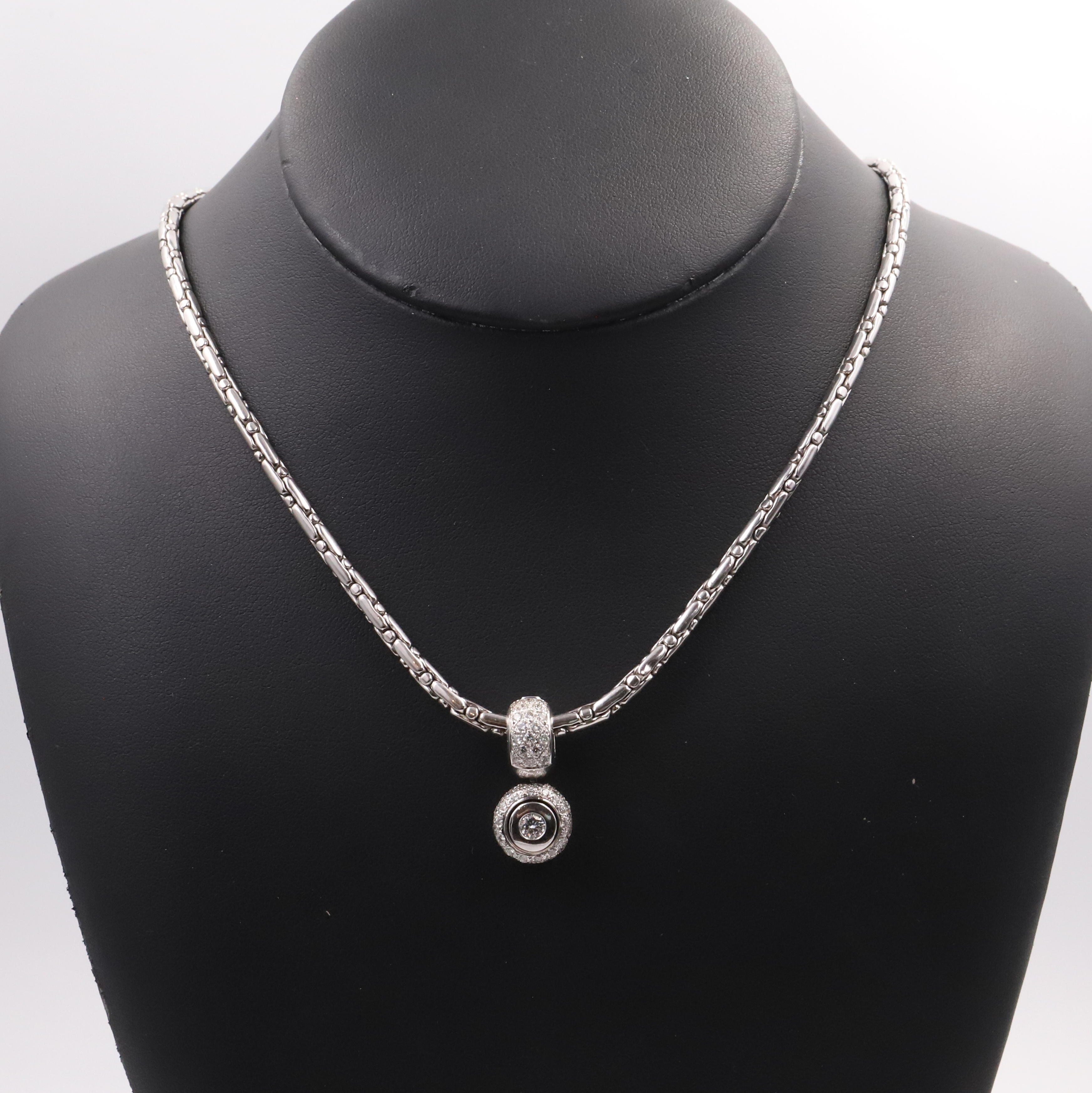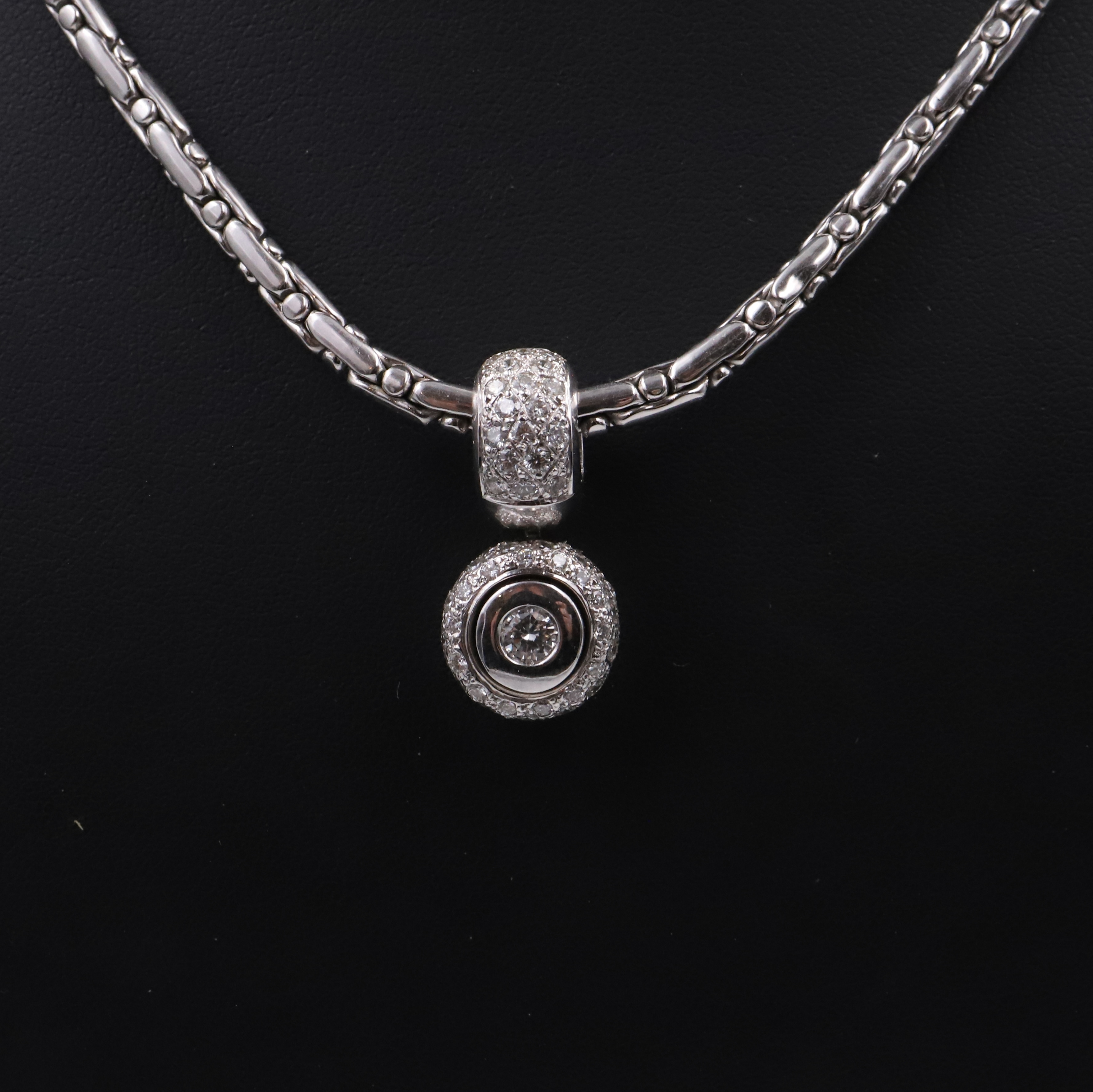 En or blanc 18k arborant un pendentif rond serti de brillants et d'un diamant en son centre.