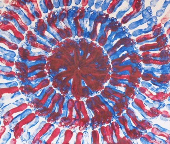 Note : Arnaud Serval développe une démarche artistique singulière. Sa nouvelle collection intitulée « Le Paradis est Là » est une exploration corporelle et spirituelle où il utilise ses propres empreintes de mains et de pieds comme medium principal. Pendant des heures, il marche, pose ses mains imbibées de peinture sur d’immenses feuilles de papier, créant des traces vibrantes qui évoquent les marques laissées par les ancêtres qui ont chanté et dansé le paysage donnant la vie. Chez les peuples premiers