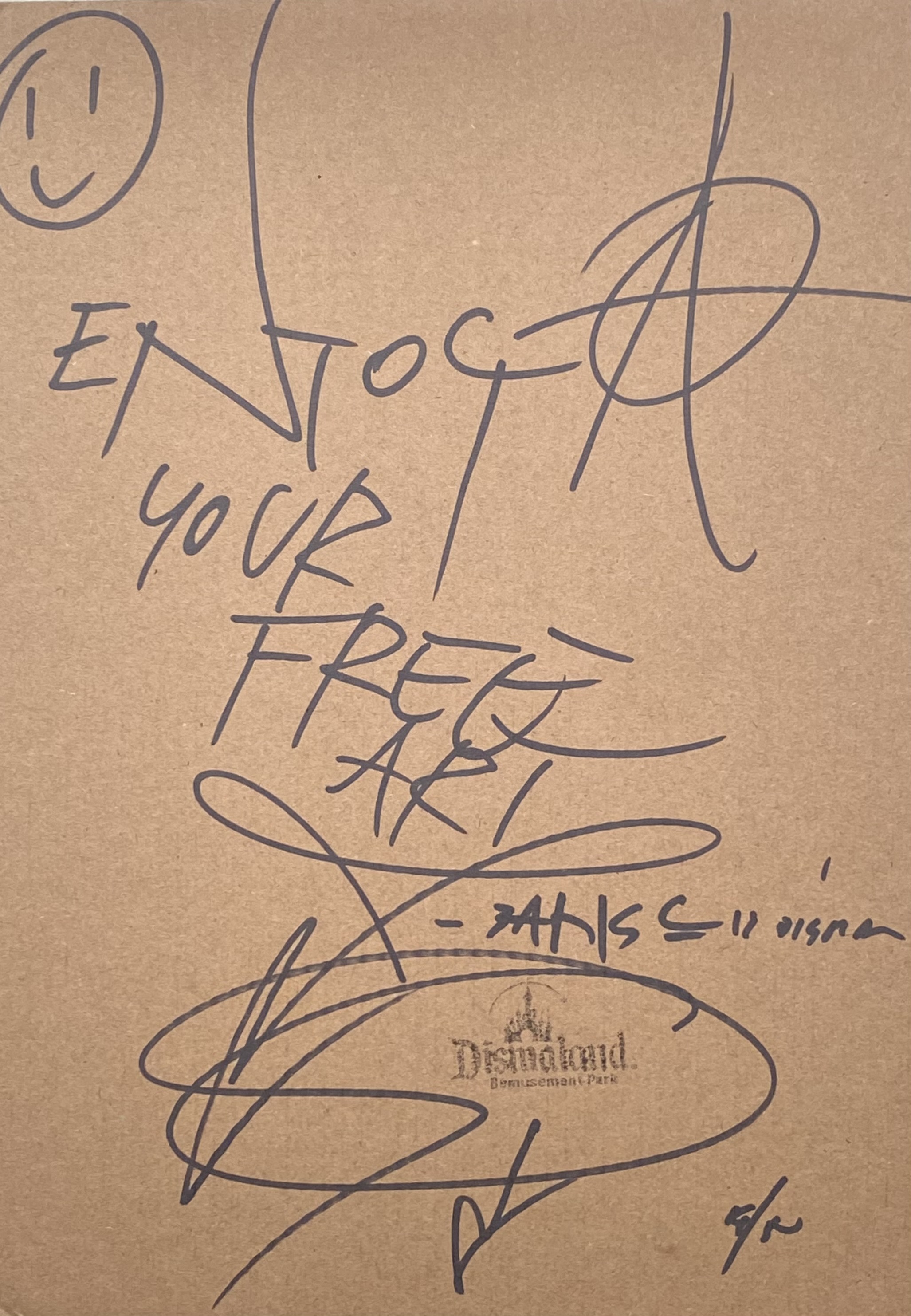 Weston Super Mare, 2015 - Souvenir de Dismaland : "Enjoy your free Art" -Aérosol et pochoir sur carton - Signé, porte la mention "BANKSY IS DISMAL" avec tampon de Dismaland .
